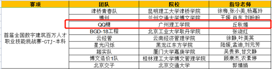 “广联达BIM5D”模块赛项--顶呱呱队获得全国二等奖和优秀组织奖,其中18工管2班温雨涵同学和18工管4班胡霖卿同学荣获广东省前三,全国前100名;指导老师:戚蕊,侯庆华,周雨薇;