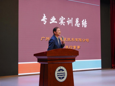 大会第五项,实训基地执行董事冯为民教授上台讲话,他从基地建设与教学模式改革创新方面中提到以人才培养为中心的校企合作新模式和以毕业生核心竞争力提高为目的的教学策划,同时也特别感谢公司领导及实训老师、知识城建管中心、中建八局、永道工程、广联达股份有限公司等相关企业对本次实训的重要支持。