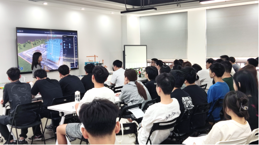 赵祺总经理以《建筑业转型升级探索》为题,从行业背景、工业化生产、智能化管理、案例分享四个方面展示了建筑业转型升级的必要性与迫切性。下午,王成刚经理就建筑工业化专项进行分享,包括装配式行业发展及国内外技术、广东省装配式评价标准分析解读、广东省装配式评价实例项目分享等方面。在交流环节,师生们积极提问,与企业专家共同探讨专业、行业发展,人才培养等问题。