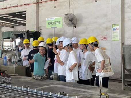 5月14日下午同学们来到位于惠州博罗的装配式构件数字化生产工厂通达公司。柳辉厂长首先进行了详细严谨的安全交底;紧接着按照提前分配好的小组跟随工厂安排的各位组长对整个工厂进行参观。师生门在工厂技术人员的带领下,参观了工厂预制构件的生产流程及生产设备,聆听了工厂技术人员对装配式构件的生产注意事项和质量控制措施的讲解。