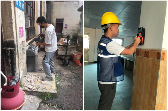 土木工程17级的田安定、陈熙国同学在进行房屋安全鉴定检测