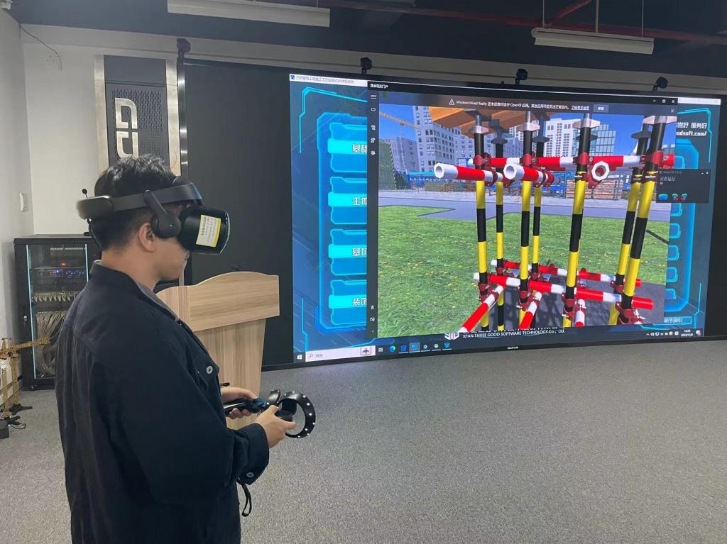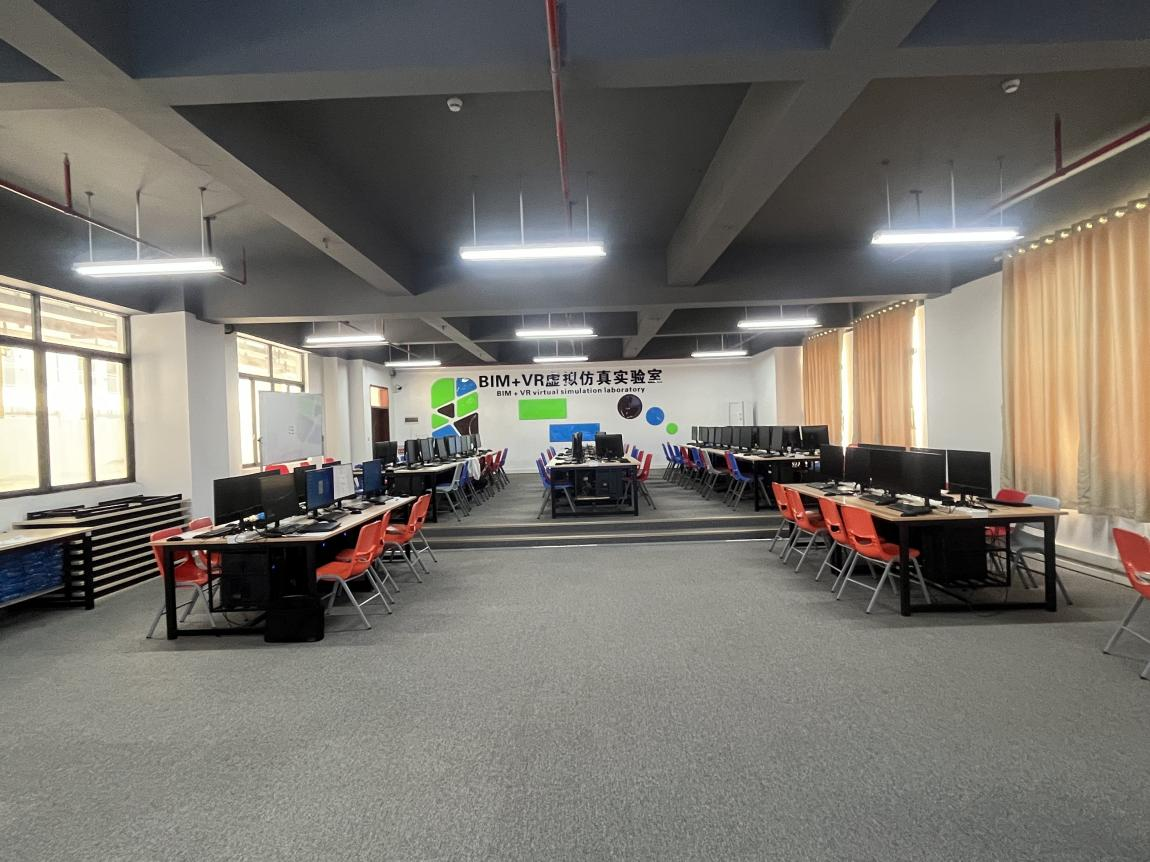 BIM+VR虚拟仿真实验室始建于2019年,建筑面积192平方米,配置跨屏和多人协同平台,部署有HGBC高性能BIM云平台和大数据智库系统、三好建筑工程施工工艺情景式 VR 体验系统、三好建筑工程虚实结合教学实训平台等三大平台,提供虚拟仿真场景搭建与虚拟仿真场景实验等两大模块,满足教与学,虚与实,理论与实际三位一体,“理虚实学做一体化”的教学模式。