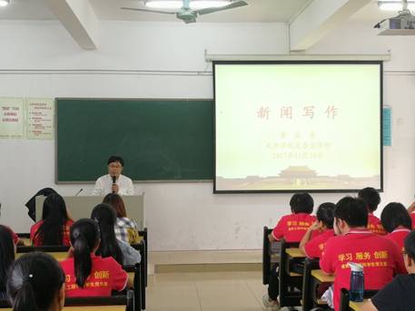 在课堂上,活跃的是老师的激情,激发的是同学们的热情。黄菲青老师用轻松幽默的话语营造了一个愉悦的气氛,提出写作的真实性、时效性,以及写作的10条规则。更阐明新闻写作要求的四个字:真、新、快、活;又以校运会作为例子,向同学们讲解拍摄作为新闻的配图时注意的要点,更以亲身经历来讲拍摄时的技巧。最后,还简要介绍了新闻照片拍摄技巧,并指出改正同学们在日常写作中所犯的错误。