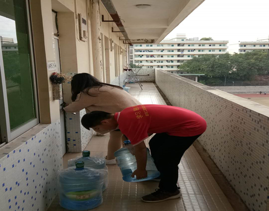 阳光照耀在送水小伙伴们的身上,送水小伙伴们的行为温暖着女生们的心。每一位送水的同学都竭尽全力的帮助需要送水的女生,将水送到她们的宿舍门口,才又回到领水处等待下一位需要帮助送水上楼的同学。每一个人的脸上都洋溢着笑容,送水的同学因为帮助他人而快乐,女生们则因得到帮助而快乐!