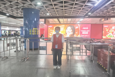志愿者维护地铁安全秩序