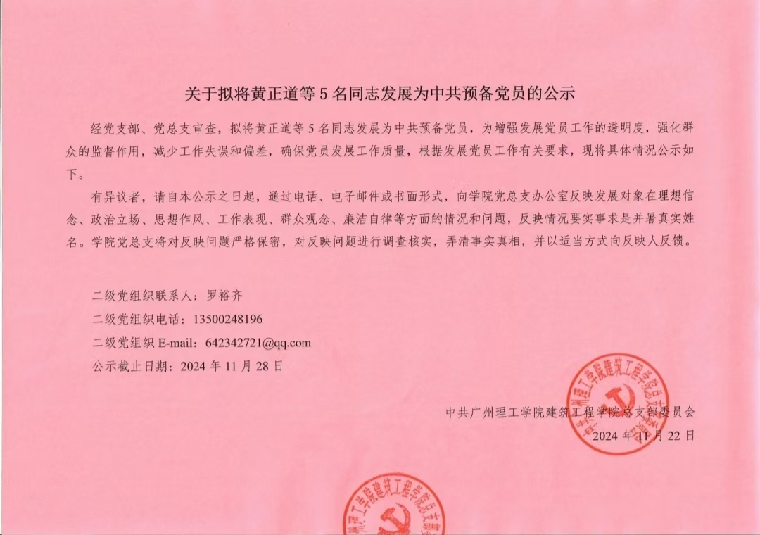 (通讯员:陈美梁)经党支部、党总支审查,拟将黄正道等5名同志发展为中共预备党员,为增强发展党员工作的透明度,强化群众的监督作用,减少工作失误和偏差,确保党员发展工作质量,根据发展党员工作有关要求,现将具体情况公示如下。