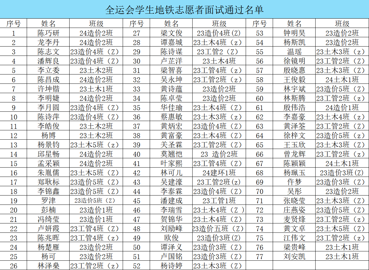最终,共有77名同学顺利通过面试。他们将在接下来的时间里接受统一培训,内容包括地铁引导服务、应急事件处理、文明礼仪规范等,并于全运会期间分批次进驻珠江新城地铁站点,协助开展乘客引导、信息咨询、秩序维护等志愿服务工作。