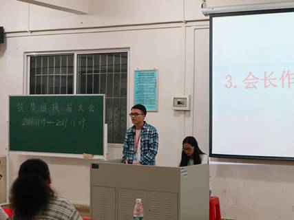 会议上,由主持人介绍了出席人员,并邀请沈艳艳老师上台致辞。她首先对上一届筑梦园的工作给予了充分的肯定,同时提到当代老员工的学习态度事宜,对筑梦园的学子们在今后的学习方面提出了几点要求。随后前任会长梁伟志作工作总结,他希望我们能把筑梦园的认真态度传承下去,发扬光大。紧接着白火云老师和理事会成员向世鹏为在过去一学年中表现突出的优秀干部颁奖。最后由新任会长邓梓明对筑梦园未来的工作作出了展望,继续加强筑梦园的建设,希望筑梦园的明天会更好!随后为新一届的干部干事举行了挂牌仪式。至此,第四届筑梦园换届大会圆满结束。