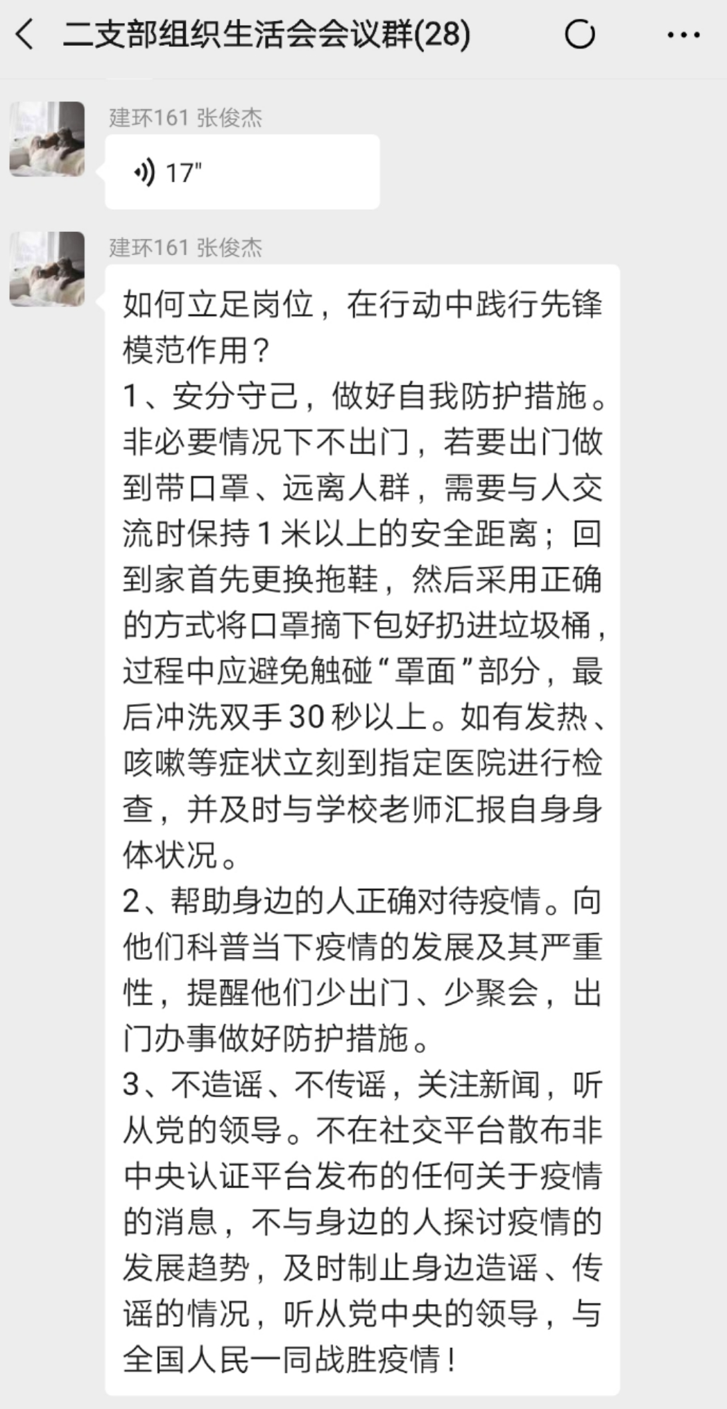 会上,党支部书记曾远秀老师就疫情防控期间开展网上专题组织会议做出要求。通过学习习总书记的重要讲话和中央重要文件,党员要充分认识到疫情防控工作的重要性、急迫性,强化党员在疫情防控工作的使命担当,确保发挥先锋模范作用。接着,全体党员就“如何立足岗位,在行动者践行先锋模范作用?”依次发表意见。①做好个人防护,并提醒身边人做好防护工作;②每天及时在今日校园APP打卡,主动上报个人健康和出行状况;③积极带头,配合公司做好“停课不停学,学习不延期”的学习任务;④“不信谣,不传谣,不造谣。”最后,党支部副书记曾鑫凯对会议情况进行总结发言。