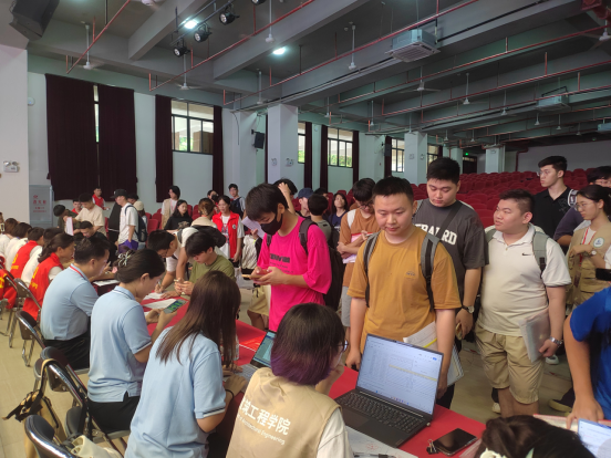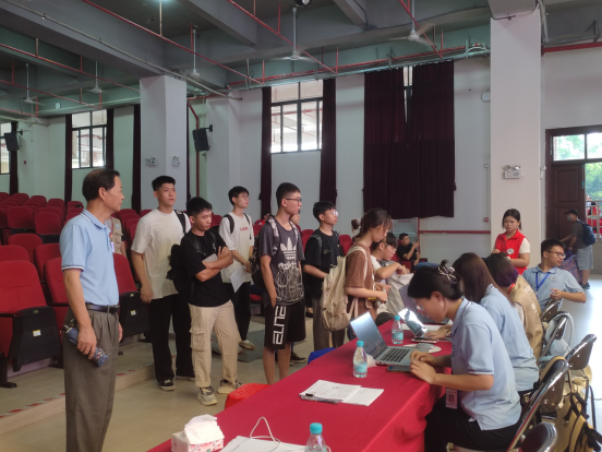 在13栋报告大厅门口处,迎新工作志愿者们积极引导新生,并将行李摆放整齐。在13栋报告大厅内,助理班主任按照既定工作流程引导新生完成报到,现场志愿者井然有序的为新生们做信息录入,解答疑难,让他们顺利完成报道。在校内各主要路口,志愿者们耐心地给新生提供引导、指示和答疑等服务。校园四处无不洋溢着迎新的喜气。