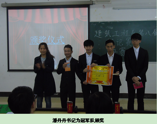 本次冠军赛在土木142班代表队与造价143班代表队间展开。比赛开始,以“诚信是靠自律还是他律”为辩题,辩论双方各抒已见,争锋相对,互不相让,激烈的唇舌之战让在场的观众为之欢呼鼓掌。正反方在辩论对方答辩后进行独到的问题分析,找出对方的漏洞,思维敏捷让人折服。比赛逐渐走向尾声,在选手与观众进行轻松的提问互动环节后,评委陈哲就比赛中双方存在的不足进行正确的引导并强调要在比赛中互相尊重。最后,由造价143班组成的反方队获得了冠军,由土木142班组成的正方队获得亚军,同时,正方一辩蔡联山和反方二辩曹柏贵获得了“最佳辩手”的称号。在热烈而欢快的气氛中,嘉宾们为获奖选手颁奖,一度将现场气氛推向高潮。