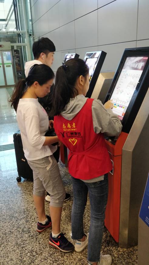 志愿者在认真帮助乘客购票