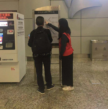 志愿者为乘客指引线路图