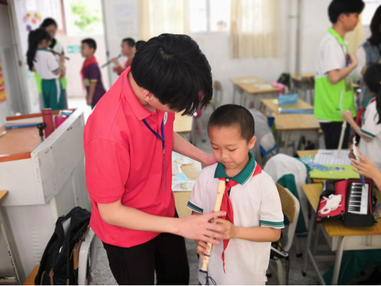 手把手指导小员工吹竖笛