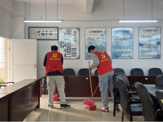 各支部活动负责人组织志愿者们分区分工合作,主要清扫区域为9栋教学楼的教室、办公室以及教学楼的周边。在清扫过程中,同志们积极主动的承担脏活累活,不仅把各自负责区域内的垃圾清扫干净,还在完成各自的工作后协助其他同志进行清扫。在全体同志的共同努力下,校园变得更加整洁美丽。