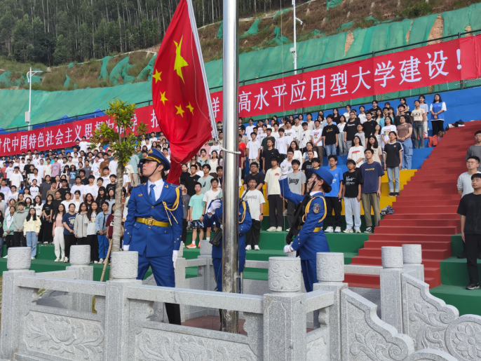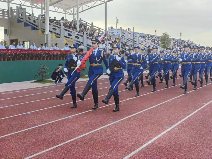 在全体师生的注目下,英姿飒爽的国旗护卫队队员们护送鲜艳的五星红旗进场,伴随着庄严的国歌奏响,五星红旗冉冉升起,迎风飘扬。在场的每一个人向国旗行注目礼,奏唱国歌。一年一度的校运会开幕仪式由此拉开序幕。董事长胡社军宣布田径运动会开幕。