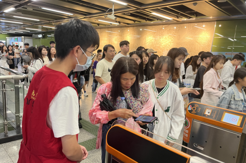 志愿者引导乘客出站
