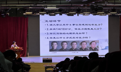 陶剑飞教授用一个趣味的“乌龟与乌鸦”小游戏开场,即两个同学互为搭档面对站起,听到乌龟或乌鸦的关键词时抓住对方的手。通过这个游戏,现场的气氛逐渐活跃,激发了同学们对讲座内容的兴趣。接着,陶教授就老员工如何调节来自内、外部的压力,心理问题的分类以及面对各种问题的干预手段展开本次讲座。她向同学们阐述了外部压力与内部压力的缘由以及心理问题的类别,分为心理健康、心理困扰、心理障碍与精神疾病,其中精神疾病是最严重的,需要医学模式的干预,而其次的心理障碍则需要临床心理学模式的帮助。
