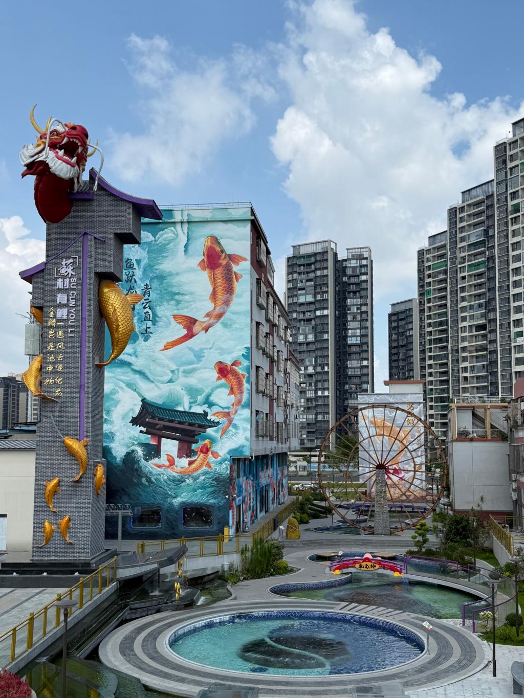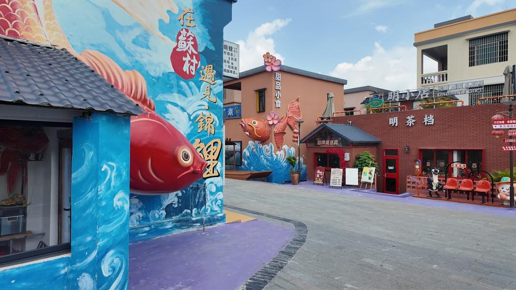 然而,今天的苏村已然旧貌换新颜。自2024年以来,高明区紧抓 “百千万工程” 机遇,以苏村为试点打造锦鲤文化街区项目,探索出文化创新赋能乡村振兴的新路径。施工单位日夜奋战,创造出 “高明速度”“荷城效率”,让苏村从城市黑点蜕变为亮点,从发展包袱转为引擎,形成了 “以文化提升为引领、以产业运营为主线、以环境改造为载体” 的低成本、可持续、可复制的乡村振兴 “苏村模式”。苏村深挖历史沉淀,以 “鱼” 为灵魂、“苏” 为期待、“锦鲤” 为希望,建成龙柱、水车、锦鲤池等标志性景观,注入全新文化内涵。如今的苏村以宜居宜商为标准,全面改造基础设施;以激活人气为目标,打造特色景点,焕发出蓬勃生机。