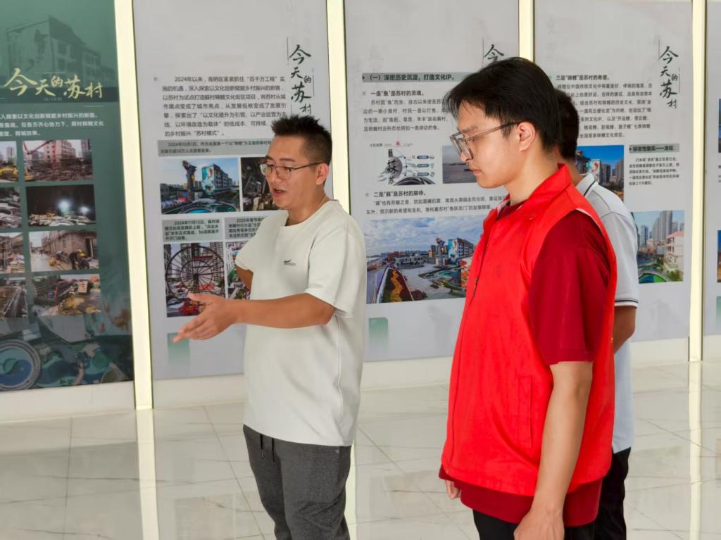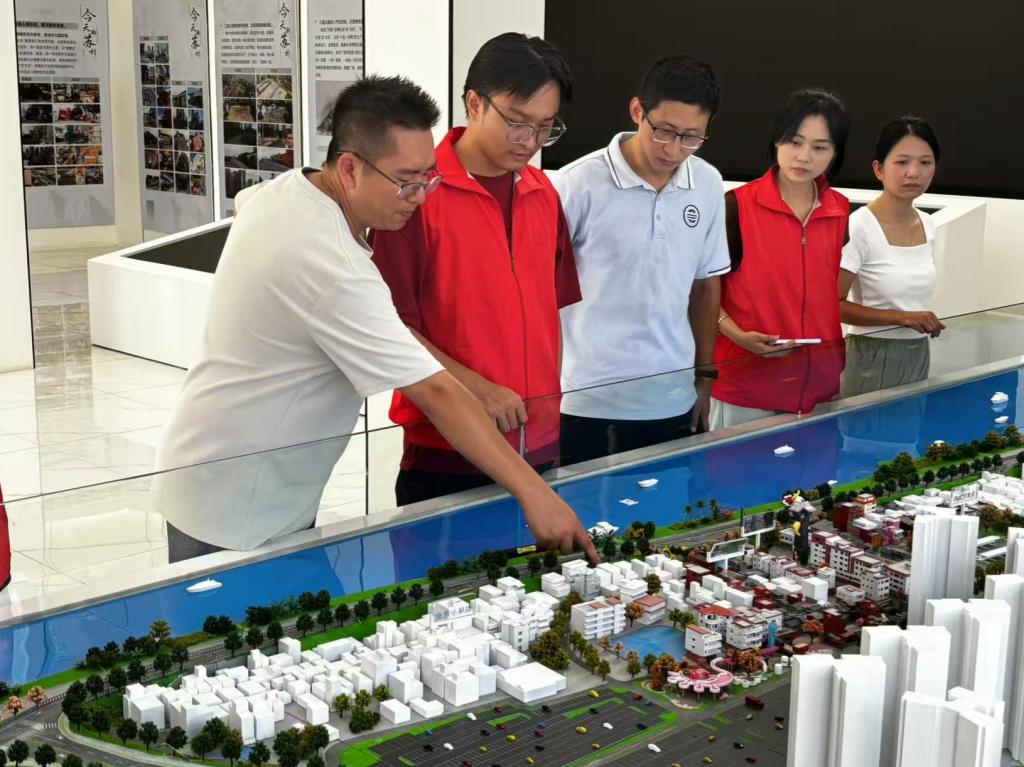 王燕贻同志带领实践团成员走进苏村村史馆,借助沙盘展示详细介绍了苏村的过去、现在与未来。据介绍,过去的苏村位于荷城街道东部,辖区面积 2.4 平方公里,户籍人口 2340 人,常住人口仅 700 人,是典型的 “空心村”。周边现代商业中心、小区和景点密集,苏村却村貌不佳、经济模式落后,成为西江产业新城的 “发展疮疤”,阻碍了新城及西江文旅经济带建设。村内房屋老旧、基础设施老化、卫生条件差,安全隐患丛生,是城市管理难题。作为全征地村,苏村无产业和企业,集体资产匮乏,村民多外出务工和经商,集体经济薄弱,乡村振兴举步维艰。