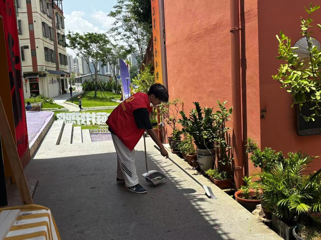 活动伊始,队员们进行讨论与分工,明确卫生清扫的重点区域与注意事项,随后队员们携带扫帚、垃圾袋等工具,深入苏村各处开展卫生清洁工作,在人行道清扫散落的树叶、纸屑,面对墙角缝隙的烟头、草丛中的塑料废弃物,队员们耐心细致地逐一清除,用脚步丈量街巷,用双手洁净环境,让社区的人行道变得更加清爽整洁。