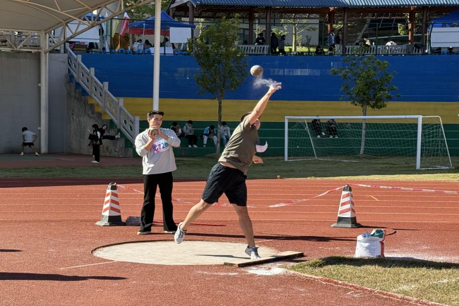 男子铅球赛场之上,张智同学展现出沉稳的实力与气势。他手持铅球稳步走入投掷区,一鼓作气,全力抛出,铅球在空中划出一道饱满而优美的弧线,重重落在远处赛场。经过多轮激烈角逐,他凭借稳定发挥荣获第六名,用力量书写了竞技风采。