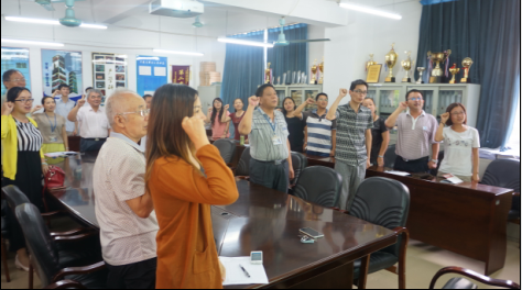“我是光荣的人民教师。我宣誓:忠诚人民的教育事业,爱国守法,爱岗敬业,关爱员工,教书育人,为人师表,终身学习,争做有理想信念、有道德情操、有扎实学识、有仁爱之心的‘四有’教师。”这是29日下午全体教职员工在“忠诚人民教育事业,争做‘四有’教师”活动中师德师风宣誓的誓词。宣誓完毕,公司李华东书记组织老师共同学习了《广东技术师范公司天河公司关于开展师德建设教育月的通知》【天院(2015)142号】文,并且当场组织全体教职员工签订了《师德师风承诺书》。并将把教师的执行情况作为绩效考核、评先评优的重要依据之一,同时也为公司教师高尚的师德形象提供了有力的保证。本次师德宣誓活动的开展,使老师们感受到了人民教师责任感。教师们纷纷表示要认真做好本职工作,用行动来践行自己的承诺。
