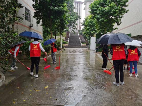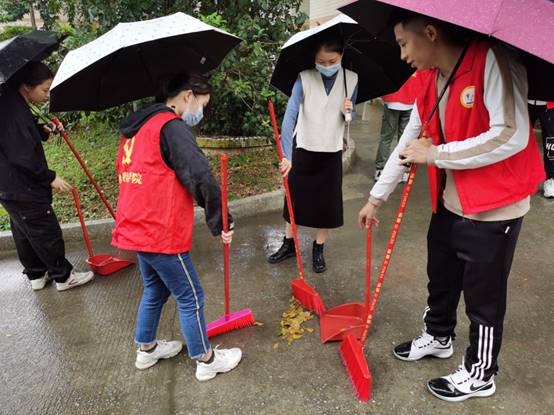 活动中,虽然下起了蒙蒙细雨,但员工党员迎难而上,以行动诠释党员吃苦耐劳、冲锋在前的奉献精神。由于下雨的原因,路面上的落叶格外难清扫,但这丝毫没有影响员工党员参加志愿清扫活动的热情。员工党员们相互配合,将走道上、花坛里、路面上都进行一一清扫,边边角角也不落下,将地面上掉落的树叶、垃圾、积水以及淤泥打扫干净。在活动最后,过道如雨后春笋般焕然一新。员工党员们以行动诠释初心,树立了坚韧的形象,在埋头苦干中体现出了不怕苦、不怕累的精神,给广大同学们起了示范带头作用。
