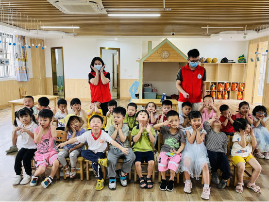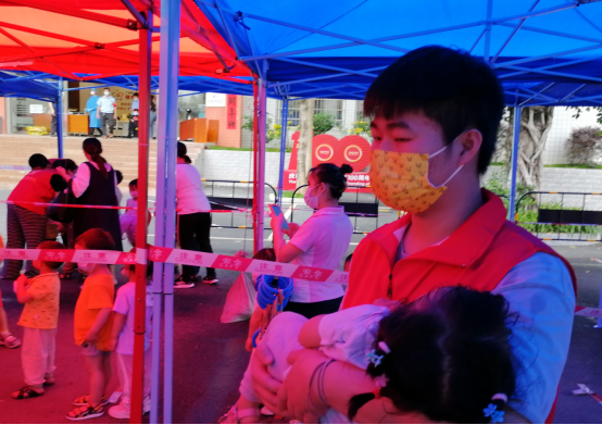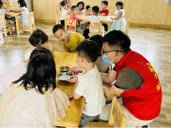 活动过程中,同志们作为小老师协助主教老师照顾小朋友,如陪小朋友们看书,看护小朋友们午睡,指引小朋友们一笔一画练好字等。此外,这三天每一天都有一项特殊活动,带领小朋友一起制作酸奶水果捞;一起清扫校园卫生;教小朋友分辨冰糖和盐。受疫情突发的影响,同志们和老师一起带领全体小朋友们前往穗丰村服务中心做核酸检测。在此过程中突发暴雨,为防止小朋友们淋雨感冒,同志们纷纷脱下志愿者服为小朋友们挡雨,这一举动受到了幼儿园老师们的一致好评。