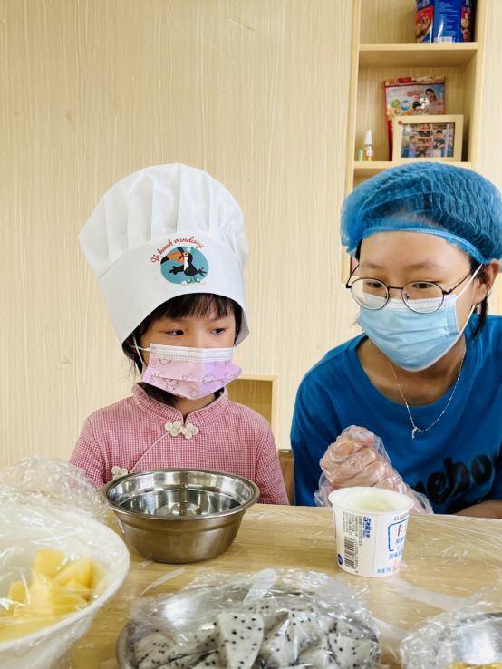 带领小朋友一起制作酸奶水果捞