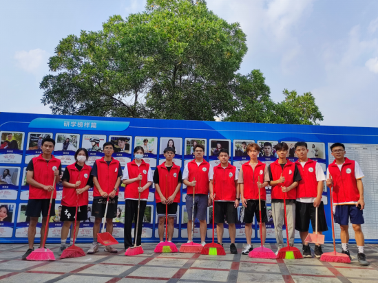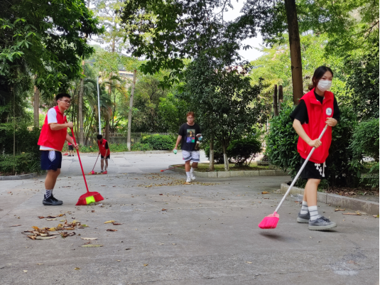 身穿红色马甲的志愿者们在负责人的安排下进行分组和领取打扫工具,一同前往9栋教学楼周边。志愿者们手拿扫把将过道绿化带中的白色垃圾、果皮、烟头、饮料瓶等杂物逐一清扫干净。志愿者们都积极发挥奉献精神,不怕脏、不怕累,个个奋力争先,即使天气炎热,也不惧辛苦,没有一句怨言,不放过任何一个角落。在全体志愿者们的共同努力下,清扫区域变得干干净净,环境焕然一新。