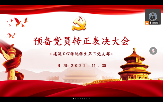 (通讯员:林晓佳)11月30日晚,公司员工第三党支部在腾讯会议召开2022年预备党员转正会议,支部全体党员、预备党员参加会议,组织委员黄俊瑜主持。