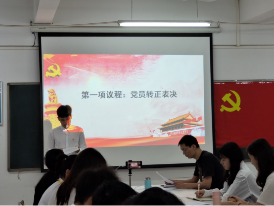 紧接着,各位预备党员的两位入党介绍人分别就预备党员在预备期内的表现及考察情况向大会作汇报,他们一致认为五名预备党员已具备共产党员条件,同意其按期转为中共正式党员。随及参会党员同志充分发表意见,对转正申请人提出异议、给予评价。大会采用无记名投票方式对是否同意五名预备党员转为正式党员进行表决。在投票统计后,张威威书记宣布表决结果:经支部大会决议,同意吴桂强、陈锐鹏、柯玮坚、温若彤及林灿濠五名预备党员按期转正为中共正式党员。