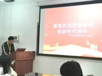 会上,杨佳梁同志对在韩志愿军骸骨回国事件以及抗美援朝的背景进行了简单介绍,随后,全体同志通过观看相关视频的方式,全面回顾抗美援朝战争的历史背景、重大战役和英雄事迹。中国人民志愿军为了国家的安危与尊严,为了确保国人不再重蹈苦难战争的覆辙,为了百年和平与发展,远赴朝鲜战场参加了为期三年多的朝鲜战争。在这期间,涌现出30多万英雄模范人物和功臣,如黄继光用身体堵住敌人枪眼,邱少云任凭烈火烧焦身体也一动不动,杨根思抱起炸药包与敌人同归于尽等等,他们用鲜血和生命证实了对祖国和人民的无限忠诚,充分展示出了抗美援朝精神的丰富内涵和时代价值。