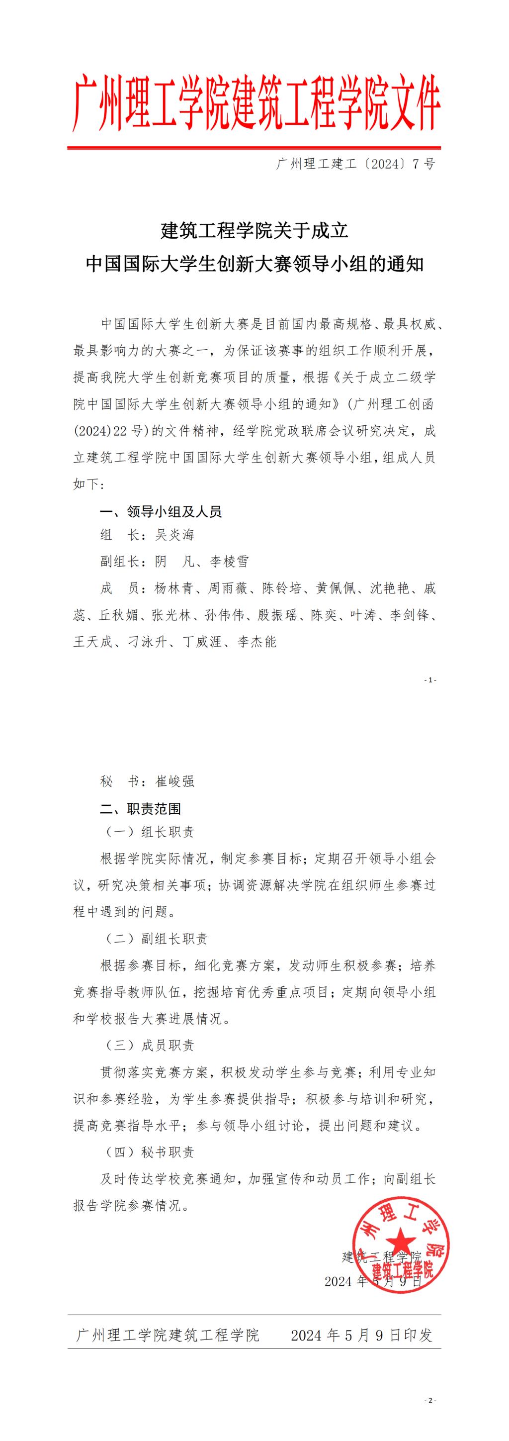 广州理工建工〔2024〕7号-伟德国际1946bv官网关于成立中国国际老员工创新大赛领导小组的通知