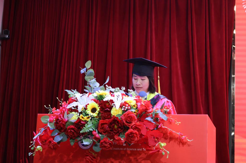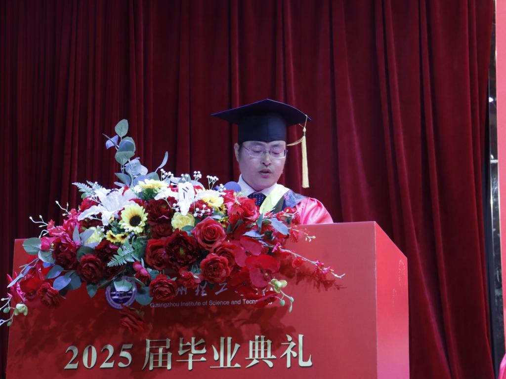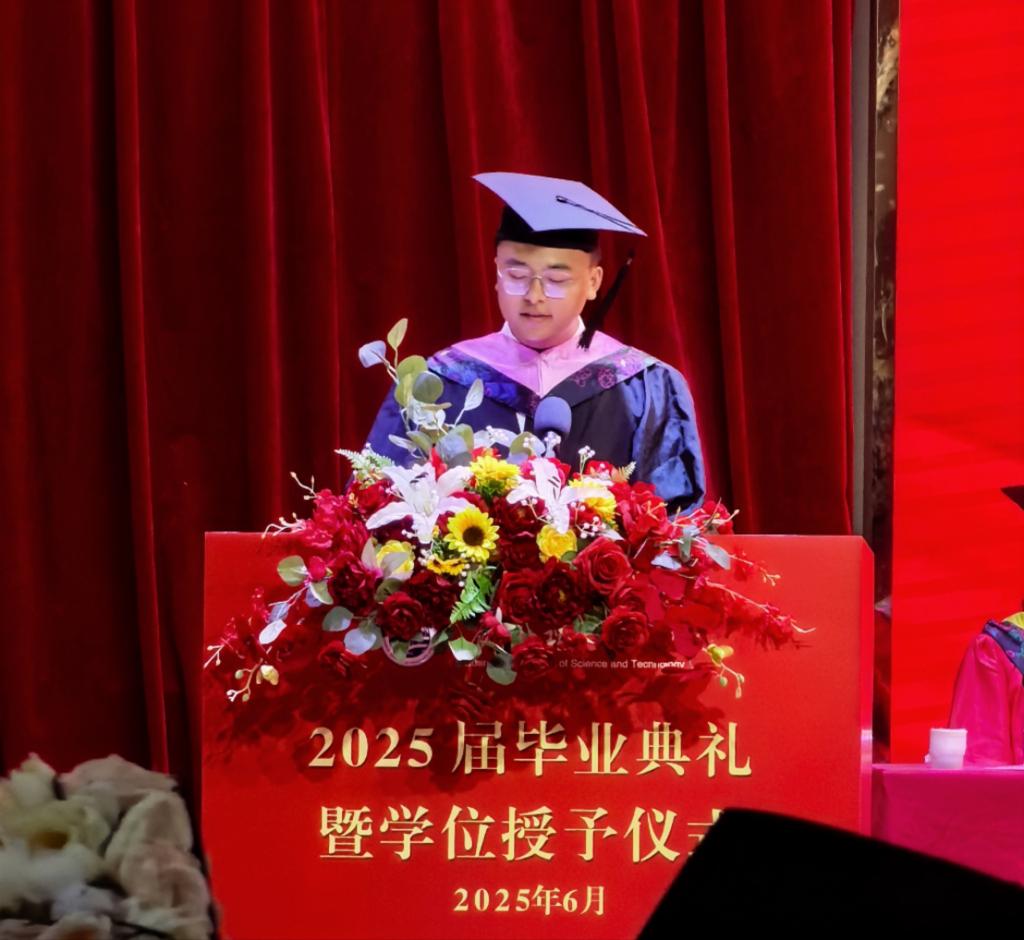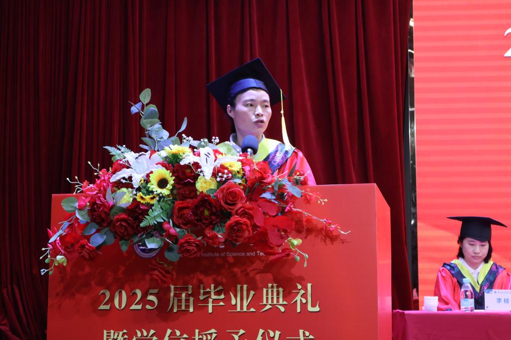 毕业生代表姚章泽同学发言,他回顾了大学期间的点点滴滴,从课堂上的专注学习,到实验室里的探索实践,从校园活动中的欢笑,到面对困难时的相互扶持,每一个瞬间都历历在目。他向悉心教导的老师、并肩奋斗的同学表达了深深的感恩。同时,姚章泽同学也坚定地表示,未来将带着在公司学到的知识与技能,勇敢地迎接新挑战,在各自的岗位上发光发热,为母校争光。