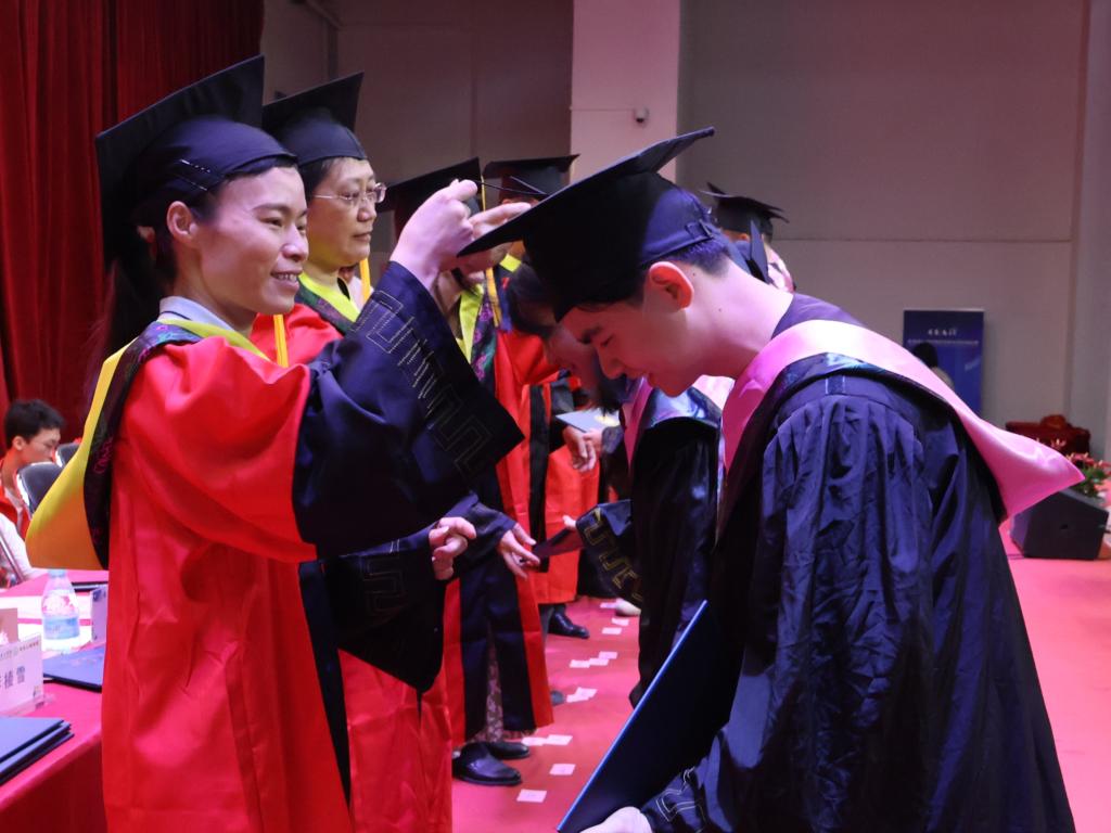 公司领导和教师们为毕业生们拨穗正冠,授予学位证书,并与他们亲切握手拥抱、合影留念。