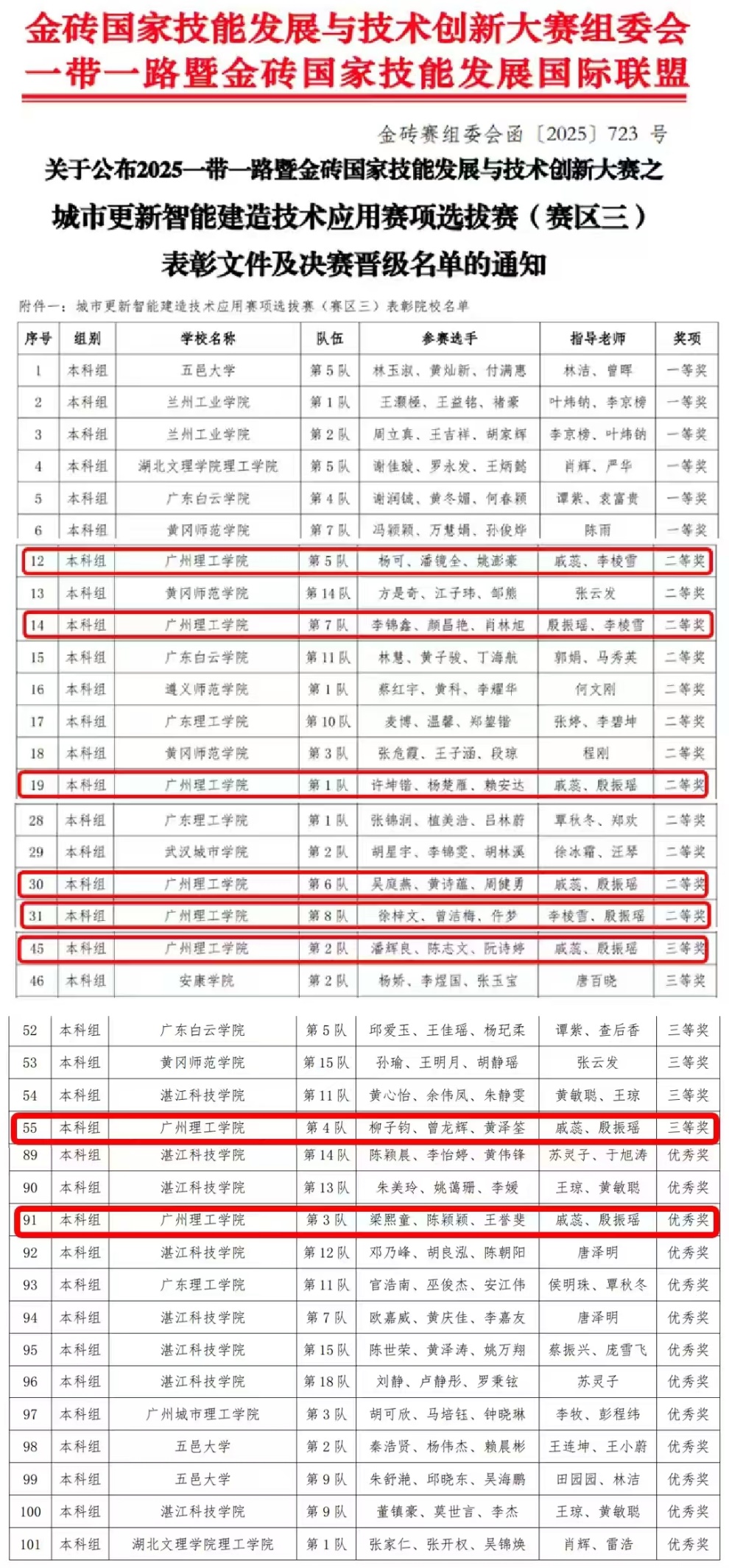 在2025一带一路暨金砖国家技能发展与技术创新大赛之城市更新智能建造技术应用赛项选拔赛中,由公司伟德国际1946bv官网牵头,联合计算机科学与工程公司、人工智能公司、智能制造与电气工程公司组建的代表队取得历史性突破,斩获五个二等奖、两个三等奖和一个优秀奖,彰显了公司在智能建造领域的创新实力与人才培养成效。