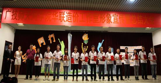 在极炫舞协会的激情劲舞下,晚会正式开始。工作室的负责人黄良辉老师的热情演讲及播放的精美视频的介绍了工作室运营状况,激发了同学们对华联造价工作室的无限遐想与向往。工作室成员代表林辉昭、钟楚玲对参加工作室的真心感悟道出参与华联造价工作室苦与乐,感染了台下众多新生。华联公司的行政总监吴江及公司副经理周玉霜的一番话语,更是引人深思,使此次总结大会的精神提升到了另一个高度。晚会中间穿插的由零距离话剧社、华联造价工作室的小品、音乐朗诵、歌曲对唱节目更是引爆全场,把晚会推向一个又一个高潮,全场一片欢呼,激情不断。最激动人心的是江总监为华联工作室的林辉昭、朱达隆、何佩玲等15位优秀成员进行了颁奖。