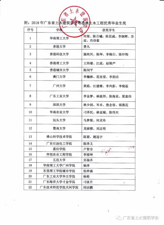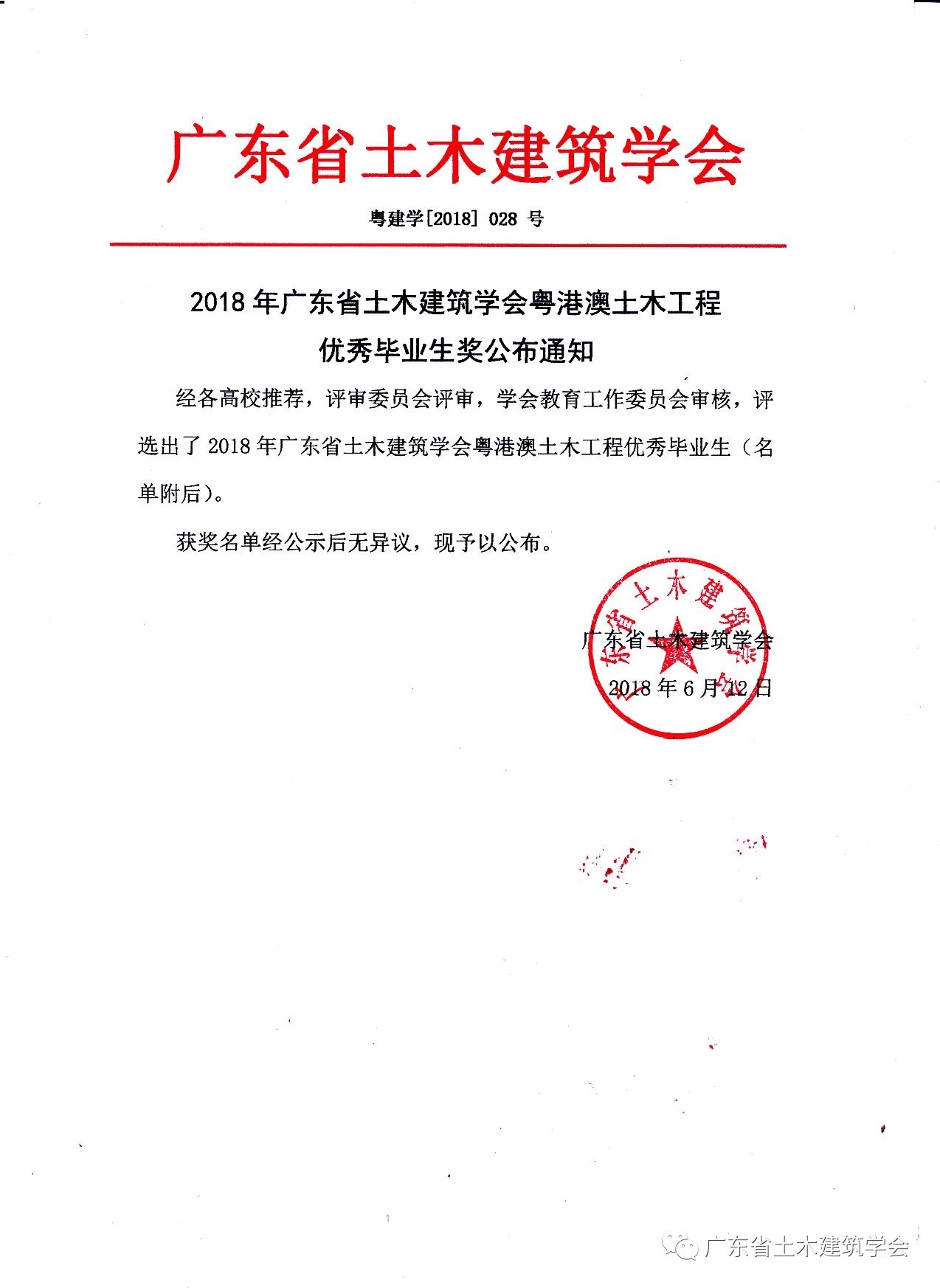 (通讯员:王丽平)由广东省土木建筑学会组织评选的2018年“粤港澳土木工程优秀毕业生”名单出炉,伟德国际1946bv官网14土木工程5班邱洁鹏获此殊荣。本次粤港澳地区共有48位员工获得殊荣,包括华南理工大学、香港大学、深圳大学等名校的毕业生。