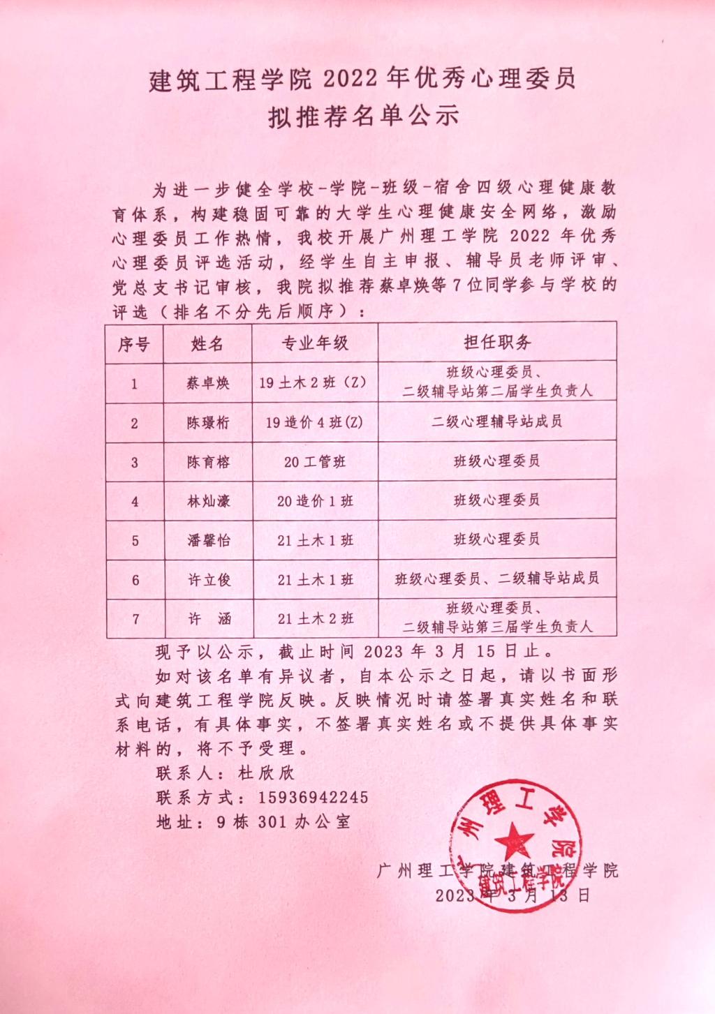 伟德国际1946bv官网2022年优秀心理委员拟推荐名单公示