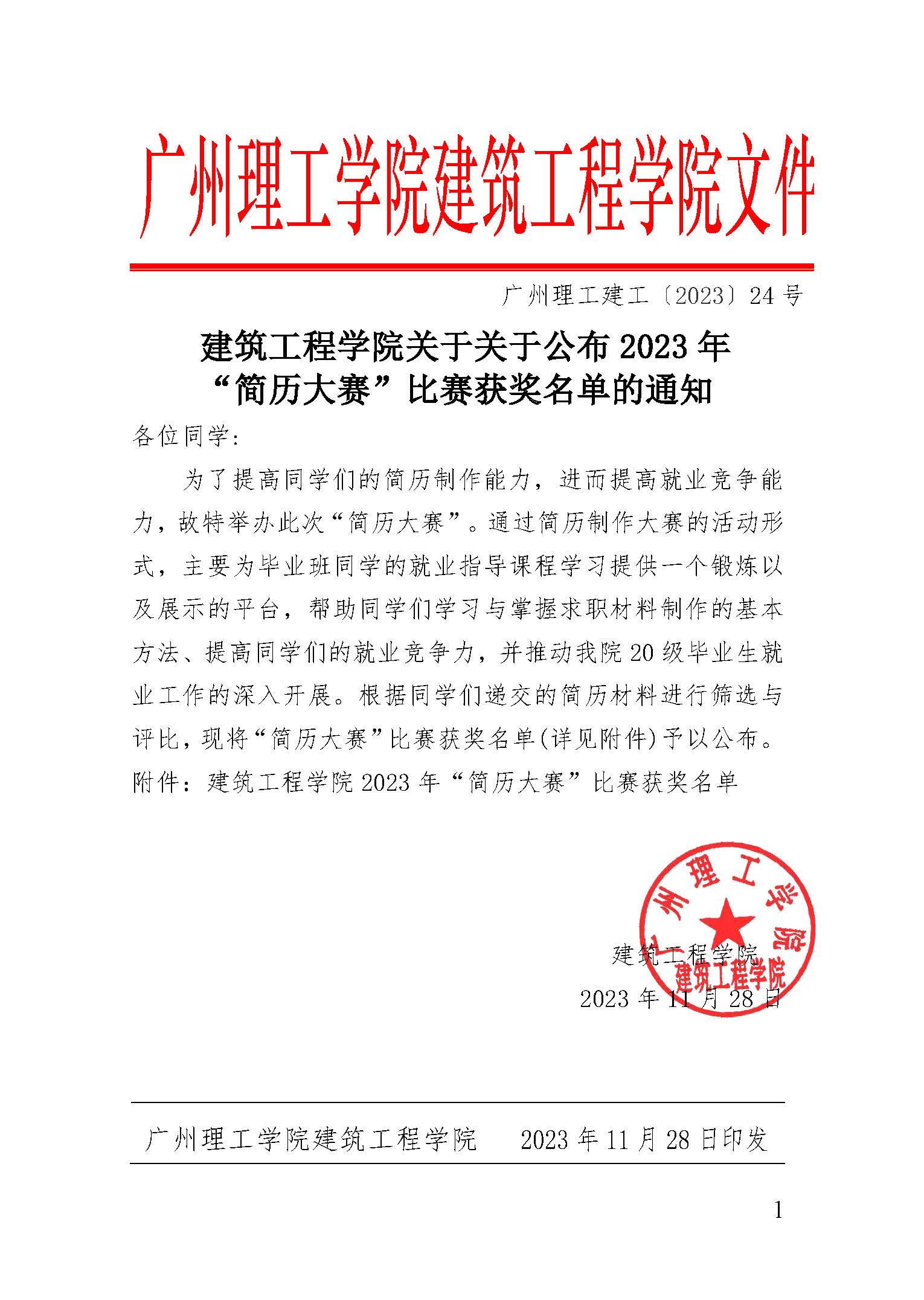 广州理工建工〔2023〕24号-伟德国际1946bv官网关于关于公布2023年“简历大赛”比赛获奖名单的通知