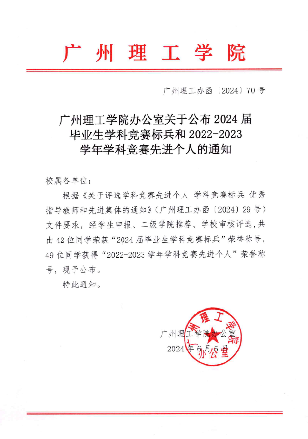 关于表彰2024届毕业生学科竞赛标兵和2022-2023学年学科竞赛先进个人的通知