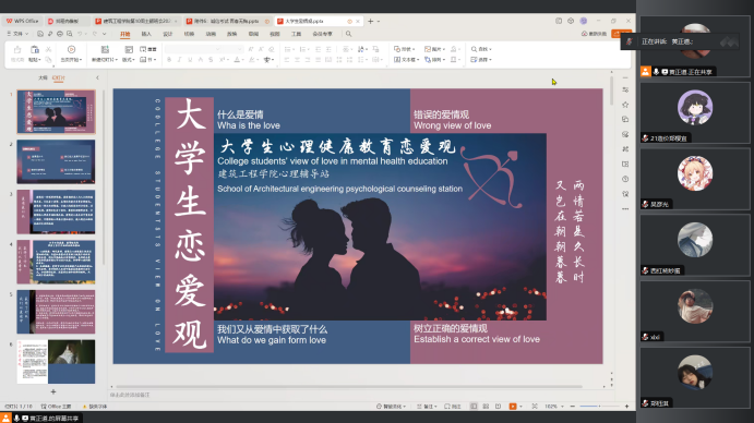 各班心理委员以“爱情的涵义”为切入点,向同学们讲述了什么是真正的爱情,并以生理和心理健康、亲密关系、学习和成长以及社会支持四个方面着手,深入浅出地为同学们阐述人们拥有正确爱情观可以收获的益处。同时,还解释了错误爱情观产生的原因和危害。由此引出,老员工需要树立正确的爱情观,建立好沟通爱情的桥梁。