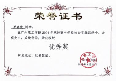 公司学子罗嘉俊同学荣获校级优秀奖